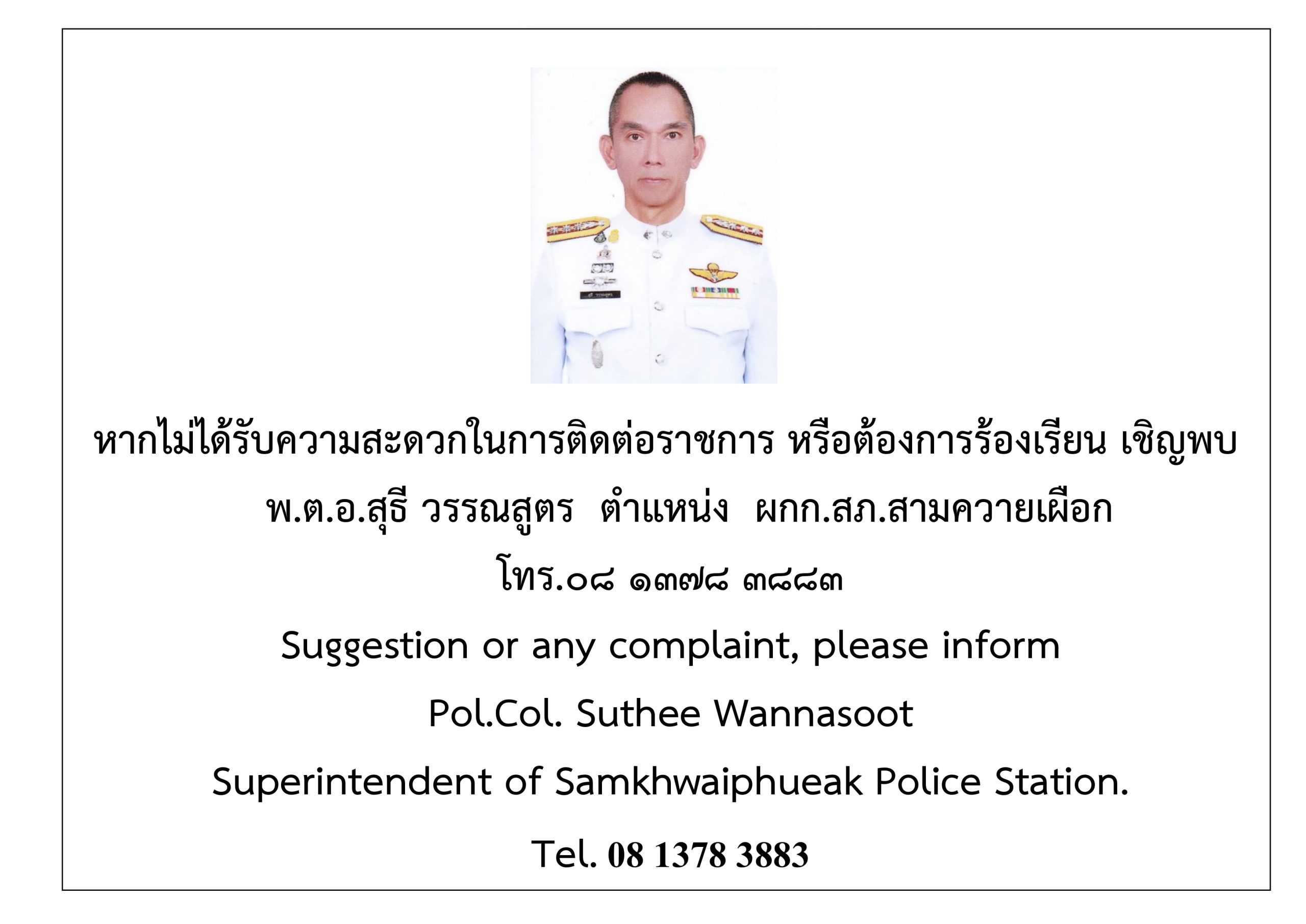 จดหมาย/ไปรษณีย์  :  สถานีตำรวจภูธรสามควายเผือก เลขที่ 122 ม.4 ต.สามควายเผือก อ.เมือง จว.นครปฐม